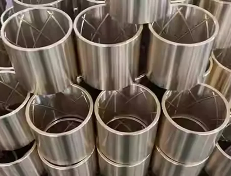 They feature a PTFE polymer lining, sintered bronze for thermal conductivity, and a steel backing for load capacity. Copper/tin plating provides additional corrosion resistance.